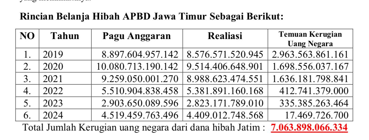 Total Jumlah Kerugian uang negara dari dana hibah Jatim : 7.063.898.066.334